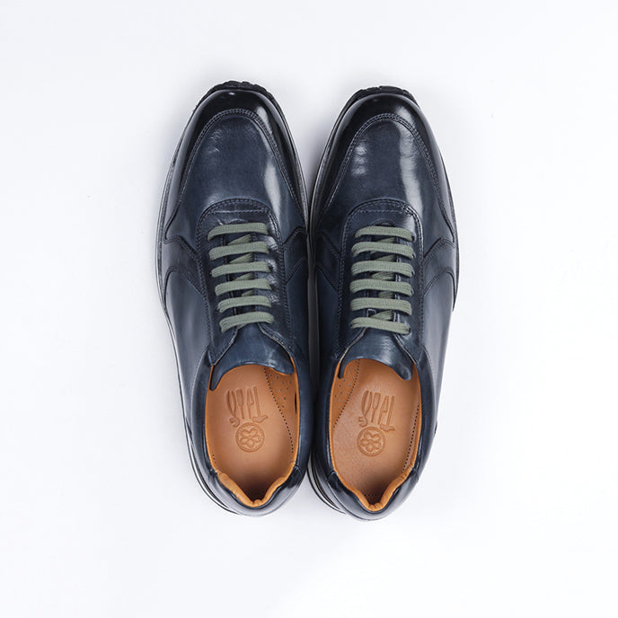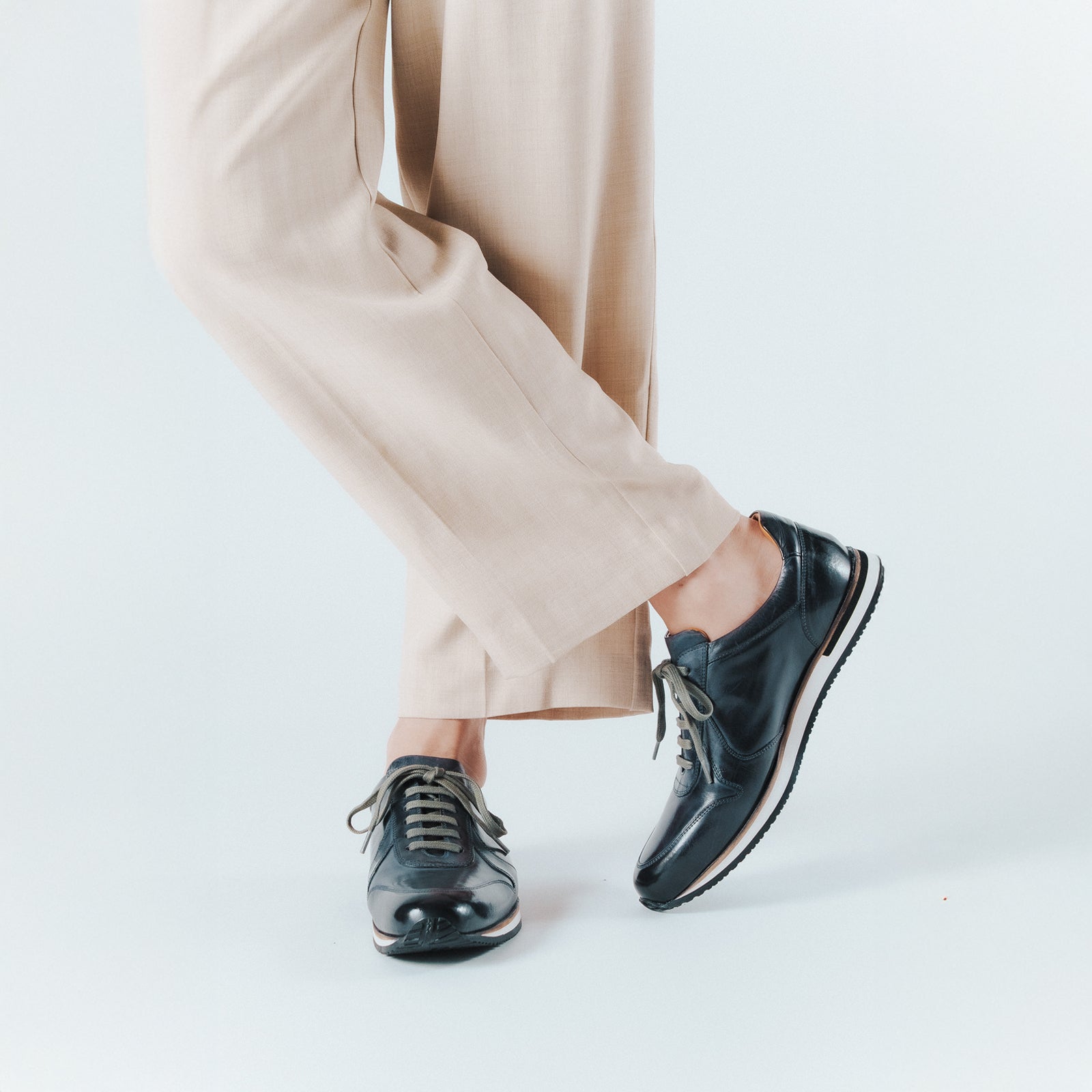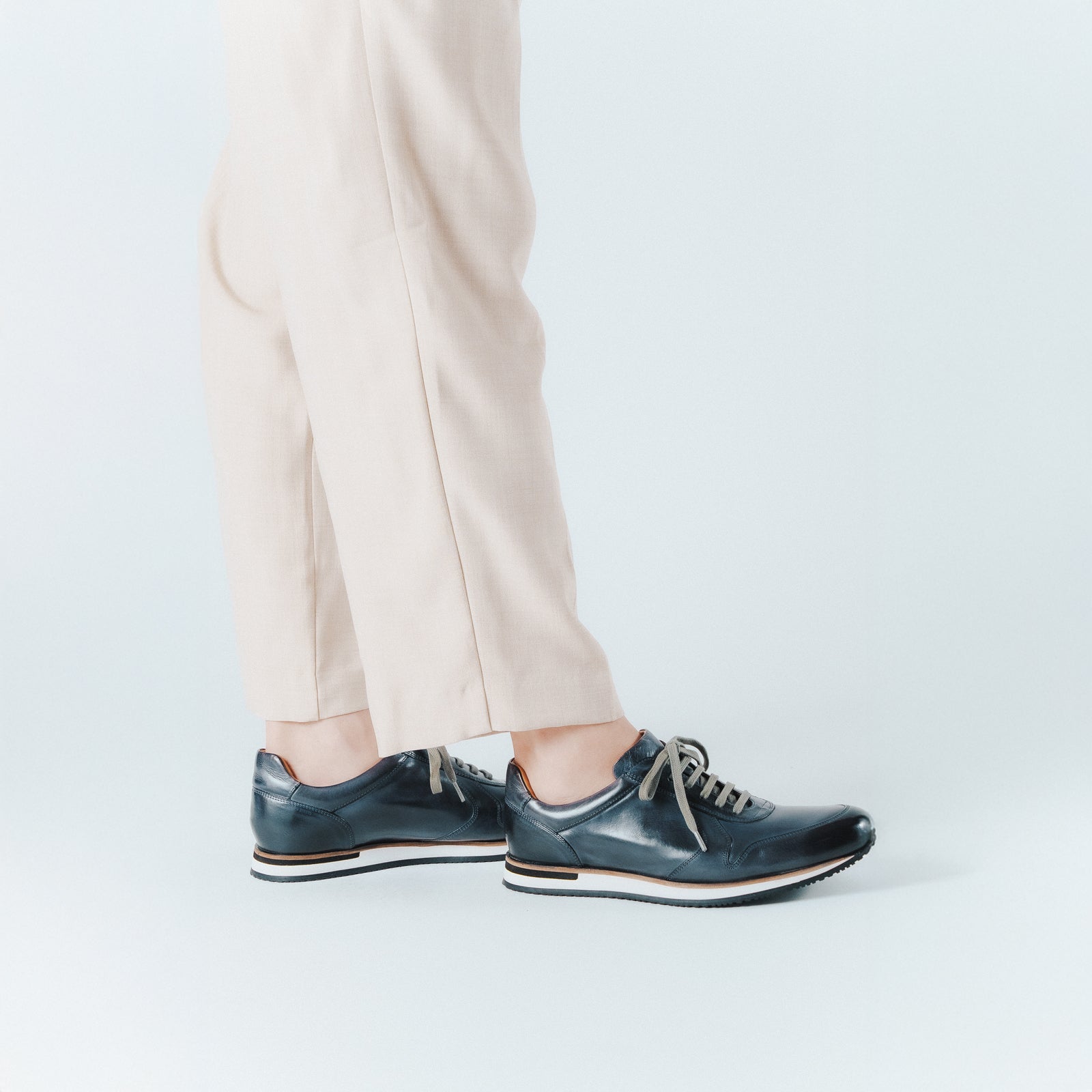 ビジネスシーン・カジュアルシーンの両方で履いていただけるようドレッシーな要素を持たせたレザースニーカーです。